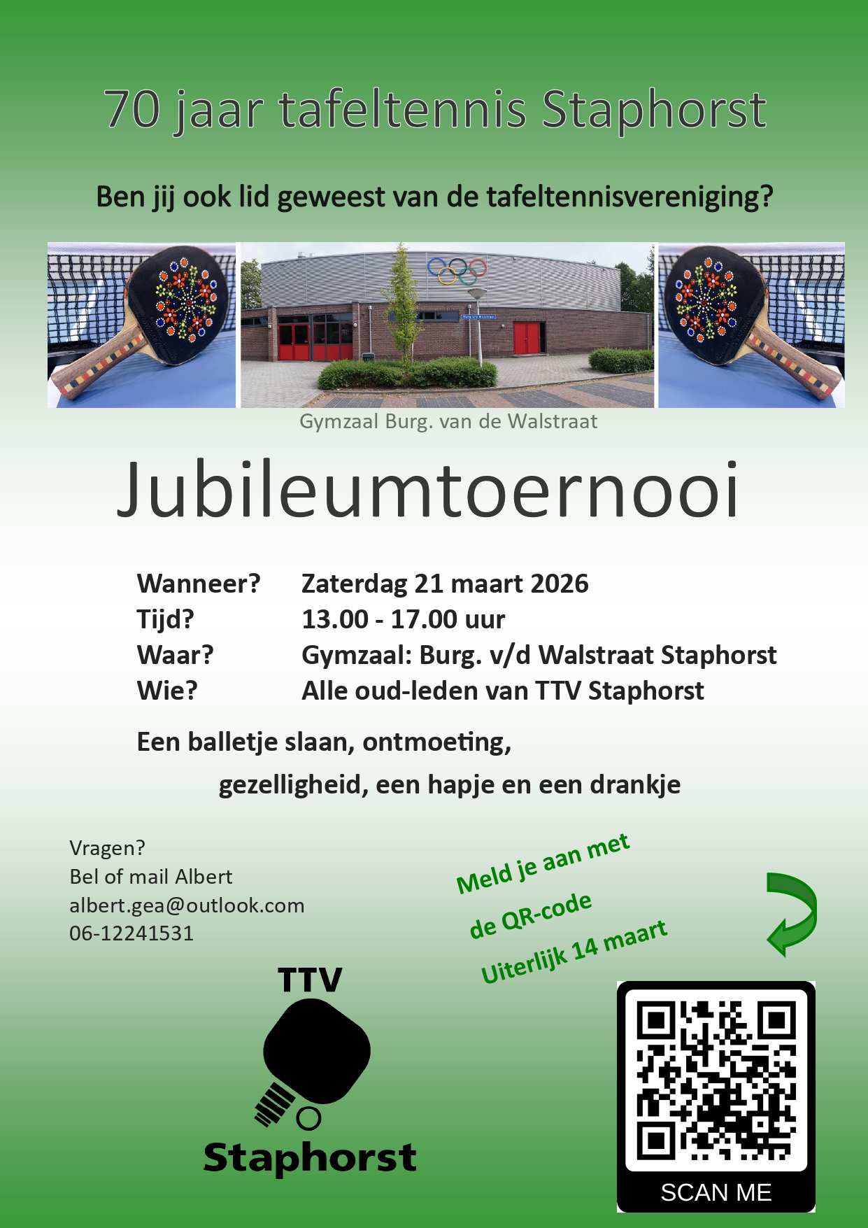 Dit jubileum zal gevierd worden op zaterdagmiddag 21 maart 2026 met een jubileumtoernooi voor oud leden. Wij hopen dat velen hier gevolg aan geven, het maximale aantal is ca. 50-55 deelnemers. Oud leden kunnen zich tot uiterlijk 14 maart a.s. opgeven. Zie bijgaande poster/aanmeldformulier met QR-code.
